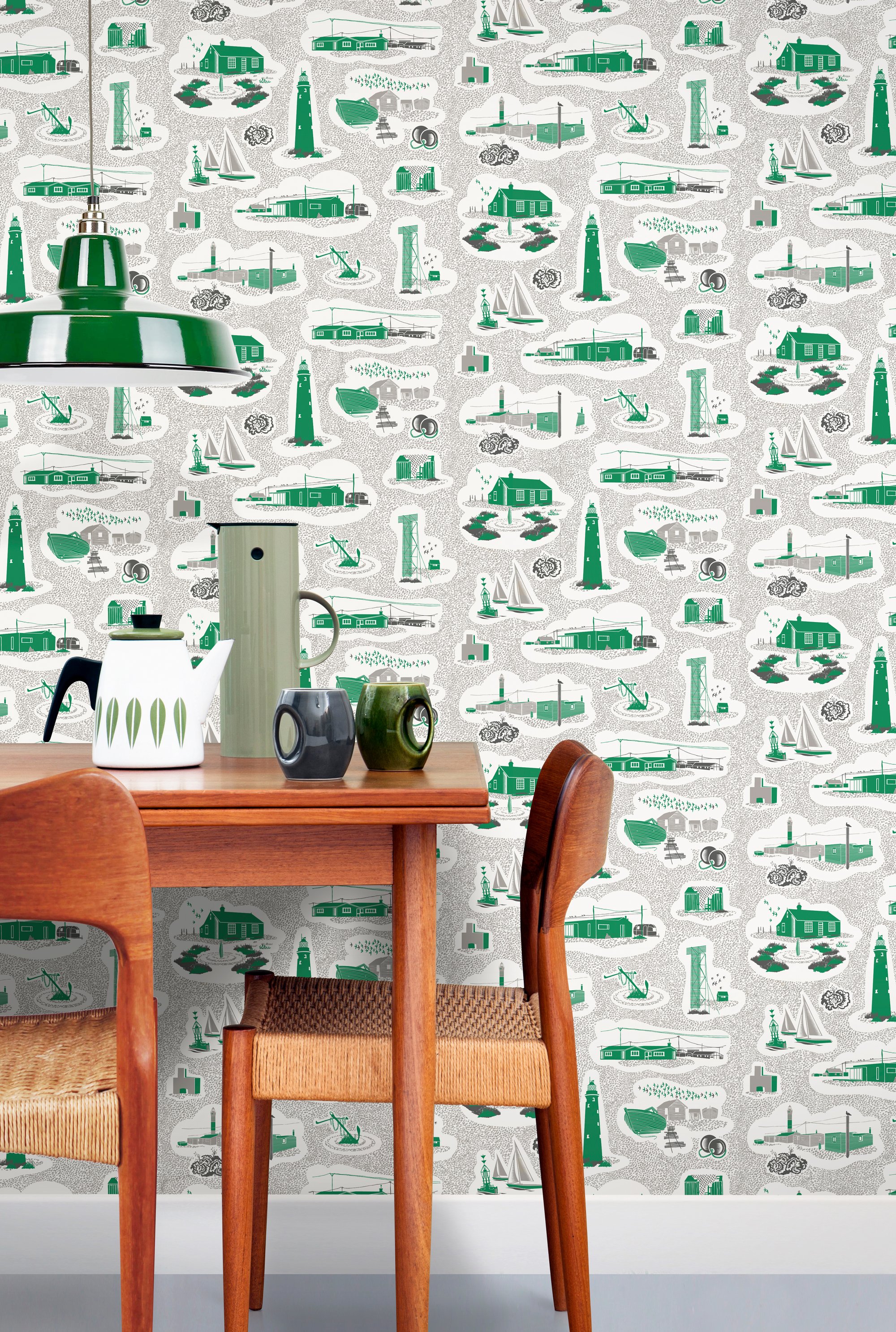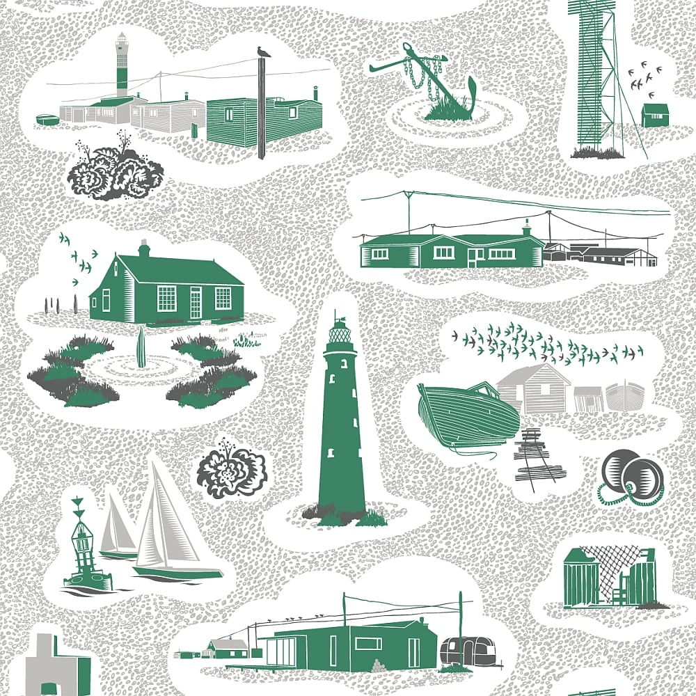 The first wallpaper in the 2014 Hinterland collection, Dungeness features a mass of shingle, punctuated by illustrated vignettes of quaint cabins, abandoned fishing boats and ramshackle huts. Anchoring the print are the two lighthouses that flank the Mini Moderns beach house.