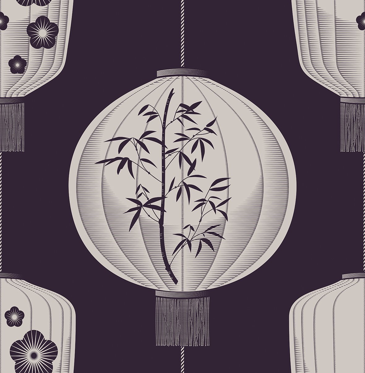 Lucky Lantern features tasseled Chinese lanterns, decorated with pine, plum and bamboo - known as Suihan Sanyou, or the Three Friends of Winter. These three symbols - 松竹梅 (sōng zhú méi) - are revered in Eastern culture, as they flourish in cold weather, and therefore symbolise strength in adversity.