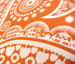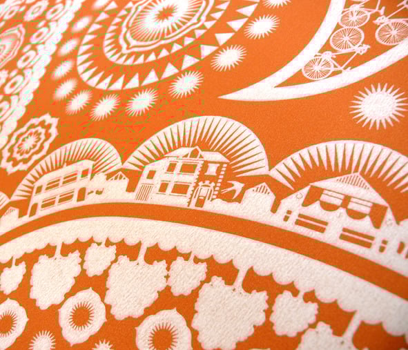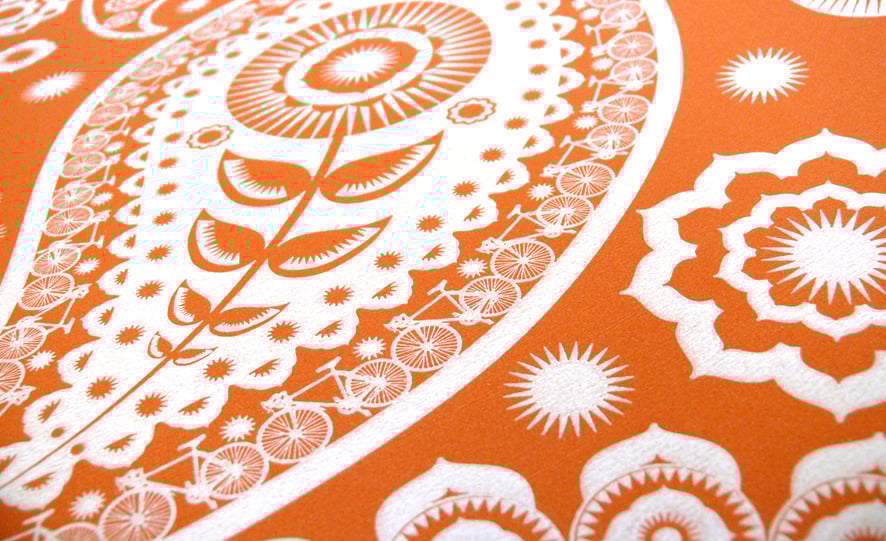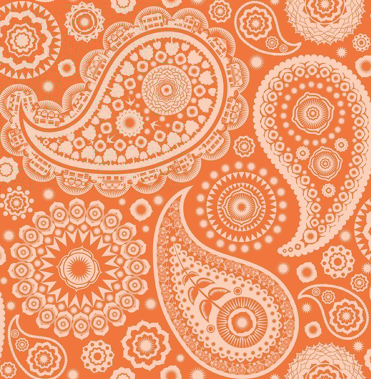 This print fuses the ornamentation of a traditional Indian-inspired paisley design with the ordered iconography of life in the commuter belt. It was a highlight of our ‘Buddha of Suburbia’ collection.