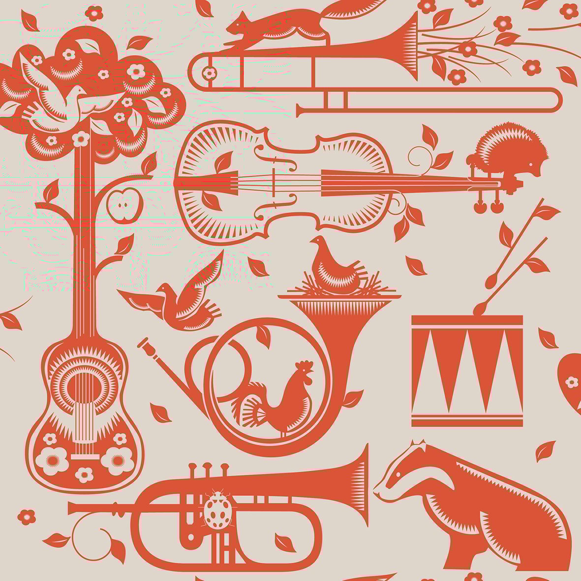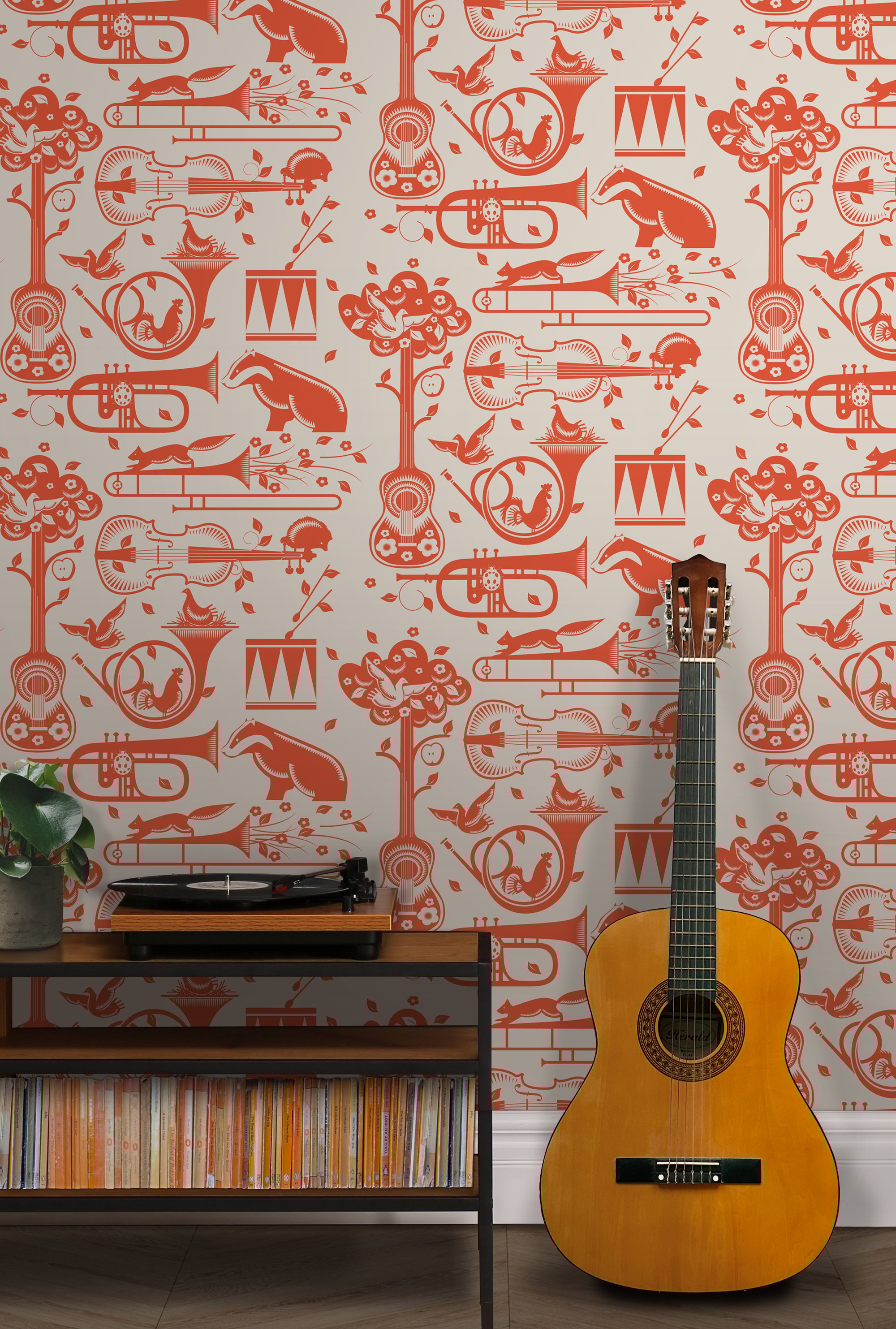 Our ever-popular Pet Sounds wallpaper depicts a cacophony of woodland music makers, along with the obligatory bird nesting in a French horn.