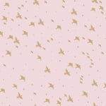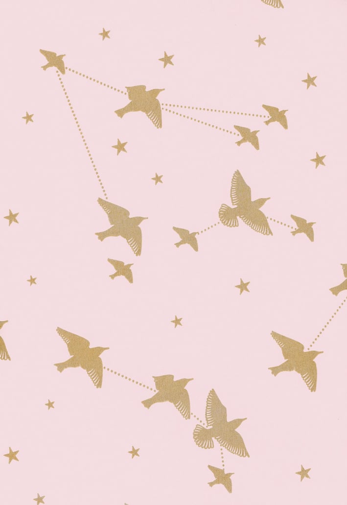 A murmuration of starlings swoop among star constellations, picked out in gold on a dawn sky.