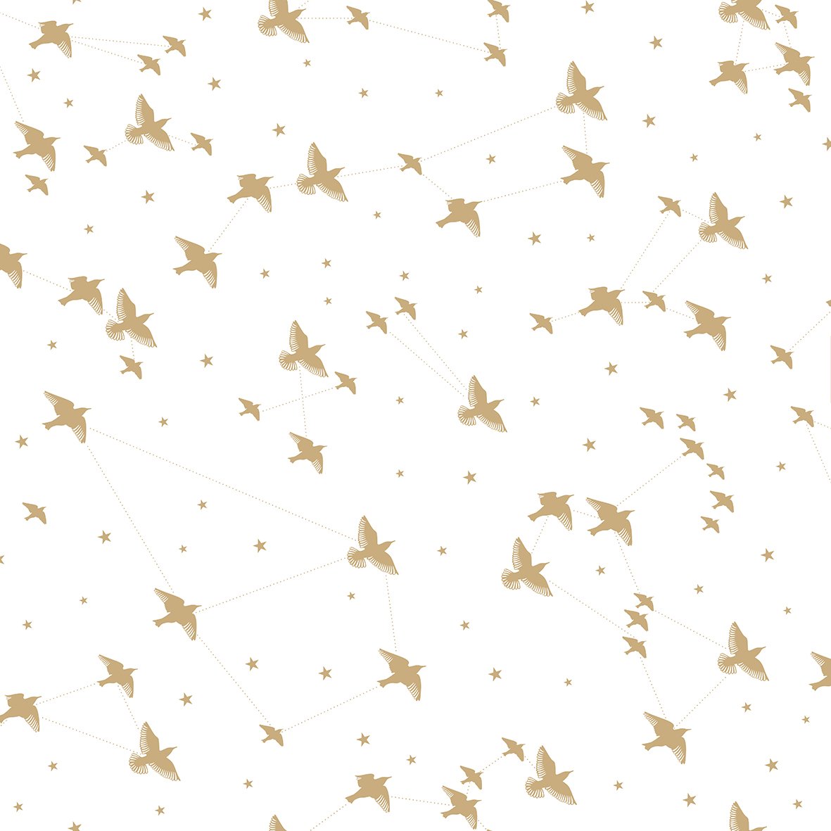 A murmuration of starlings swoop among star constellations, picked out in gold on a snow white base.
